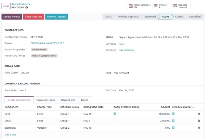 - Company-wise Rental Configuration: Configure deposit account, approvals for new contracts, and separate approvals for closures/cancellations.