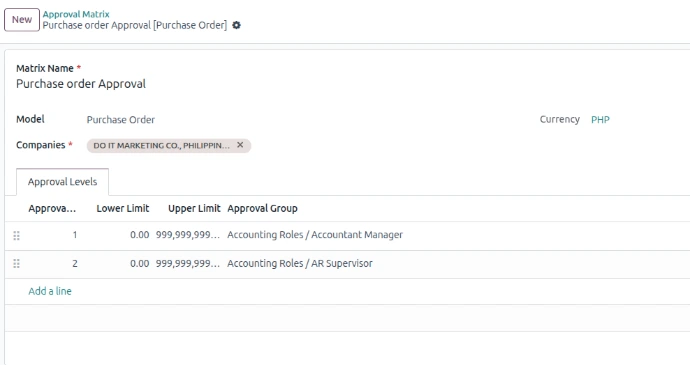 Setup approvals up to 5 levels per amount range ( Lower / Upper limit). Each level can be assigned to a User Group so the right people approve at the right time.