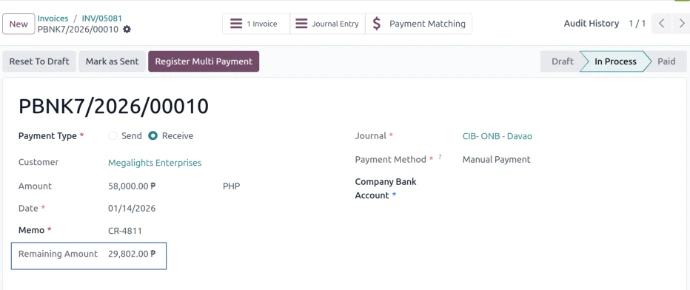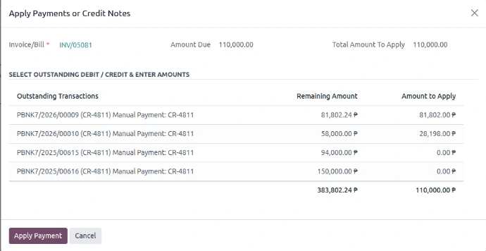- Remaining balance: Clear visibility of unapplied advance balances.