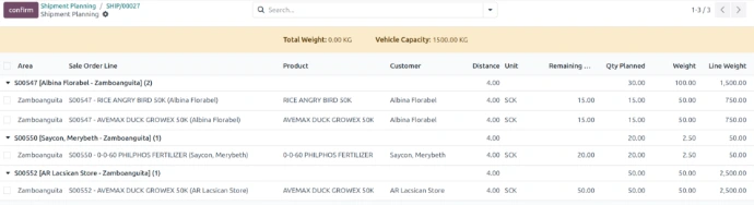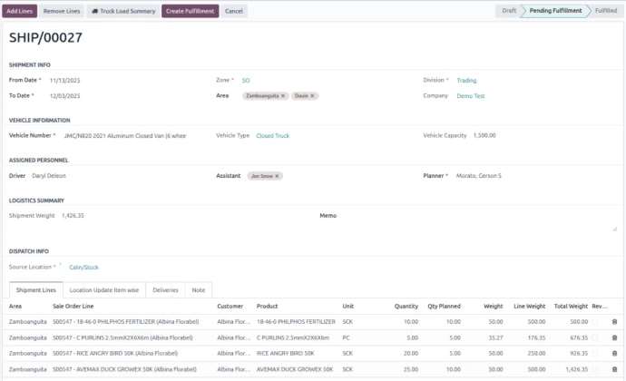 - Shipment Plan Setup: Create a plan with From/To Date, Zone, Areas, Company, Vehicle (auto Type/Capacity), Driver, Assistants, Planner, and Source Location.