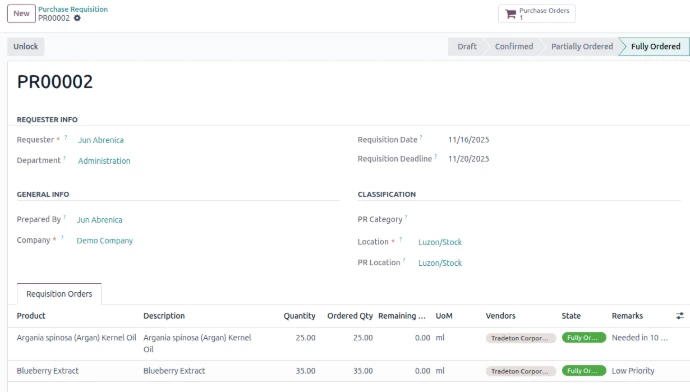 - Track PR lifecycle from request → confirmation → ordering → fulfillment with clear visibility.