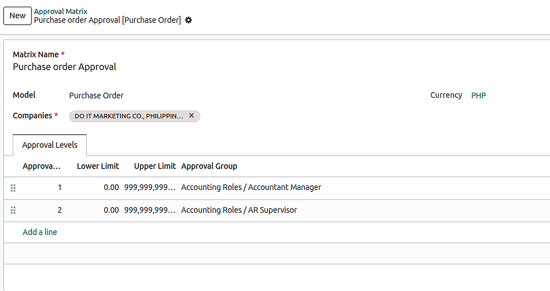 Setup approvals up to 5 levels per amount range ( Lower / Upper limit). Each level can be assigned to a User Group so the right people approve at the right time.