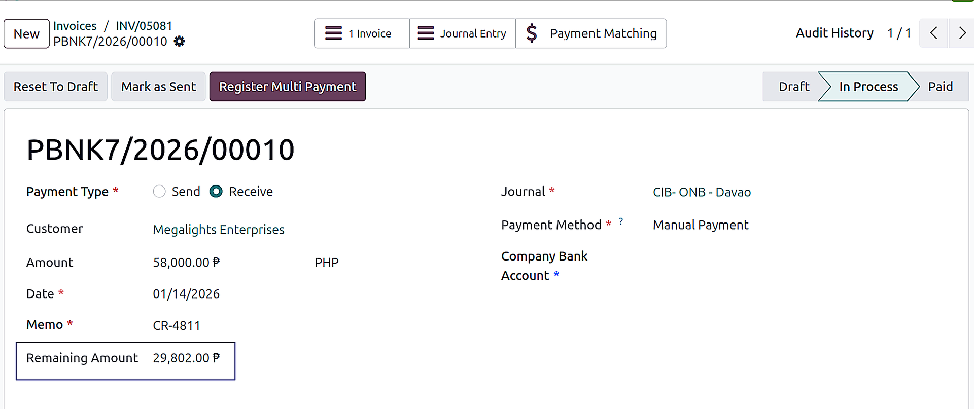 - Remaining balance: Clear visibility of unapplied advance balances.
