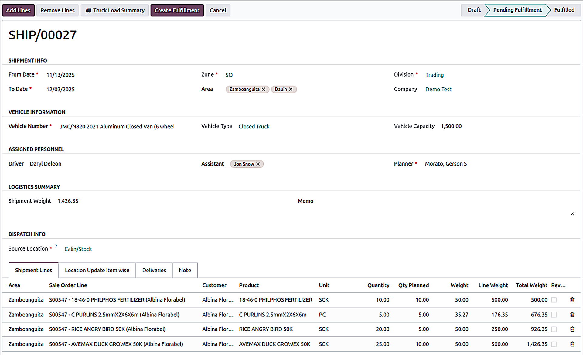 - Shipment Plan Setup: Create a plan with From/To Date, Zone, Areas, Company, Vehicle (auto Type/Capacity), Driver, Assistants, Planner, and Source Location.